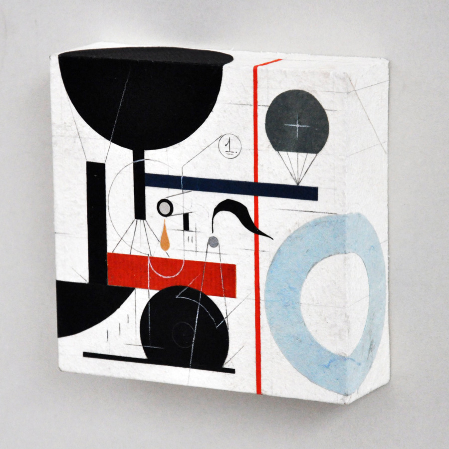 The piece was created in cut paper and graphite on paper mounted on a 5″ x 5″ x 1.5″ wood panel.