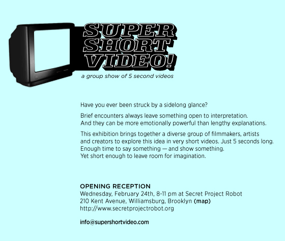 For those who can’t make the show (like myself), the video collection will eventually be posted to supershortvideo.com. (I’ll post my piece here then too).