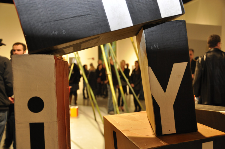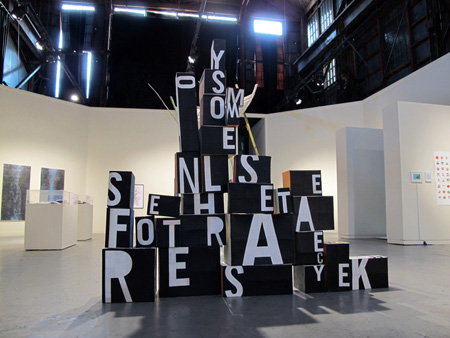 Ultimately though, I’m more concerned with unpredictability than inevitability. I’m interested in the installation’s course of mutation (and mutilation) over time; a narrative driven by human interaction. As these cardboard towers of Babel rise and fall daily, they generate streams of shifting typographic prophecies box by box, glyph by letter, and color by shape through intent and accident, amounting to unique convergences of cause and happenstance. The only guarantee is surprise — a winning proposition.