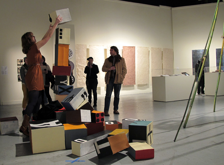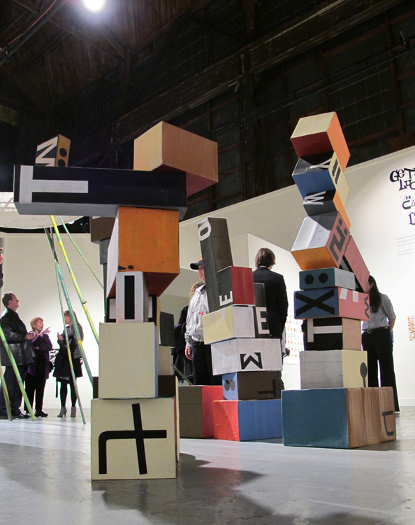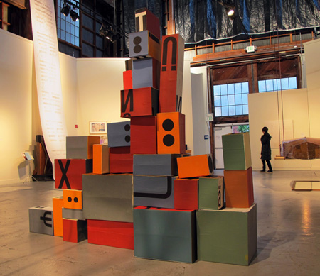 Tomorrow’s Headlines is an interactive piece that invites the public to manipulate a set of forty cardboard boxes of various colors, shapes, and embellishments to create an evolving series of structural and graphic permutations over the course of the exhibition. By combining the boxes’ diverse letterforms and symbols in various ways, guests may speculate on future language hybrids with which to write tomorrow’s headlines today.