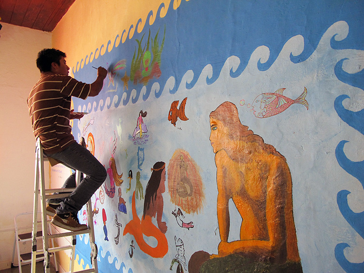 Eager to help Claudia, we gladly accepted her invitation to start a mural with the kids in the building’s library space. The theme was mermaids, inspired by a poem that would appear on the wall in Spanish, English, and Tzotzil. We began with painting a blue seascape area which the community populated with an array of sea maidens over the course of our week in San Cristóbal.