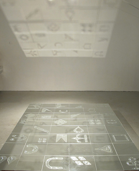 MELT is an evolving installation that I’m working on in the studio these days. The first iteration of the artwork was limited to the floor, consisting of an array of ‘water drawings’ designed to evaporate over time on a 6×8 foot mirrored grid. I’m now experimenting with reflecting light off the artwork onto surrounding walls to suggest submergence.