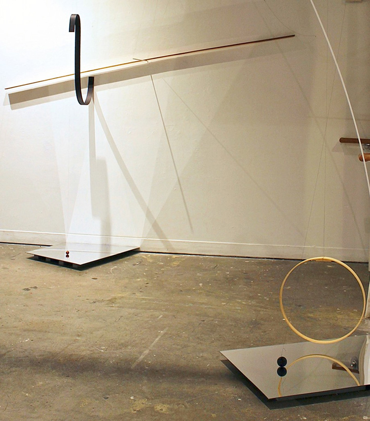 Projections 2 and 3 are my contributions to MFA Now 2014, an exhibition of 17 Bay Area grads at Root Division in San Francisco. The two floor-and-wall installations are situated perpendicular to each other, functioning as a diptych. They engage in dialogue with one another through threads strung overhead suggesting transmission wires or similar paths of communication. On the wall these lines splay into shadows and drawn graphite lines suggesting a larger, possibly infinite web bound by cosmic phenomena.