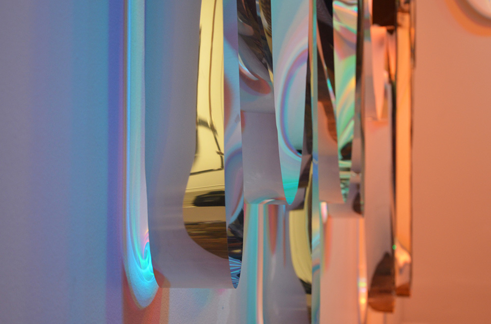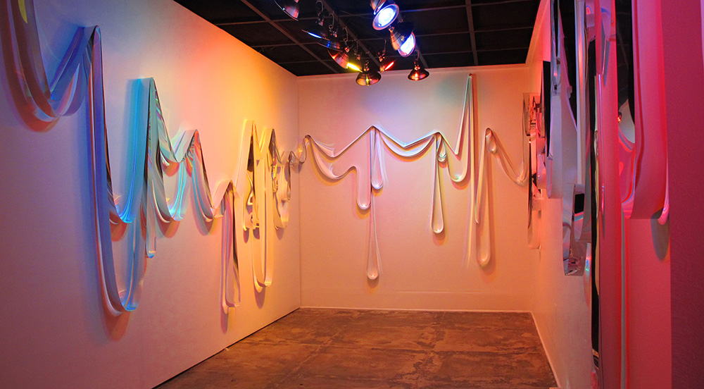 I utilized Mylar to explore light, color, material, and reflectivity in referencing concepts of transition, modulation, and mutation. This piece treats light in a painterly manner, blurring the boundaries between Mylar, wall, and reflection. In doing so, the space from the area in front of the wall extends into a virtual space beyond it, allowing viewers to deconstruct perceived shifts in dimension and perspective.