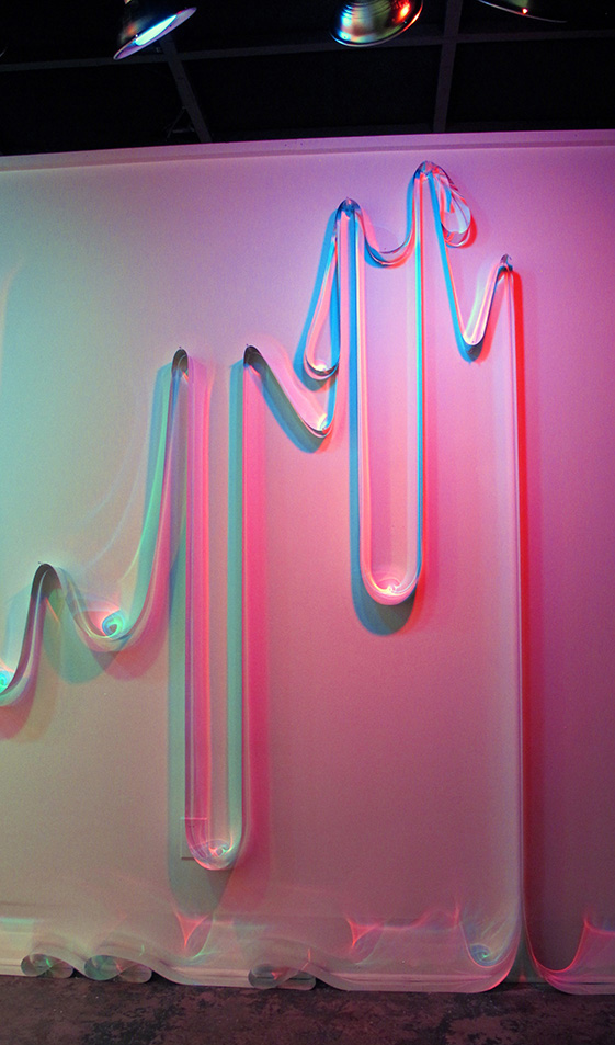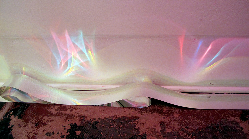 My wall installation, Phase Transition, was created by cutting long, two-inch strips of metallized polyester film, commonly known by the trade name Mylar, that were then draped into loops and hung from clear dowels, giving the viewer the impression of dripping water. The Mylar, with its metallic sheen that sways lightly in the wind of passersby, reflects brilliant shades of green, blue, and red on the wall, facilitated by colored flood lights that shine on the installation from above.