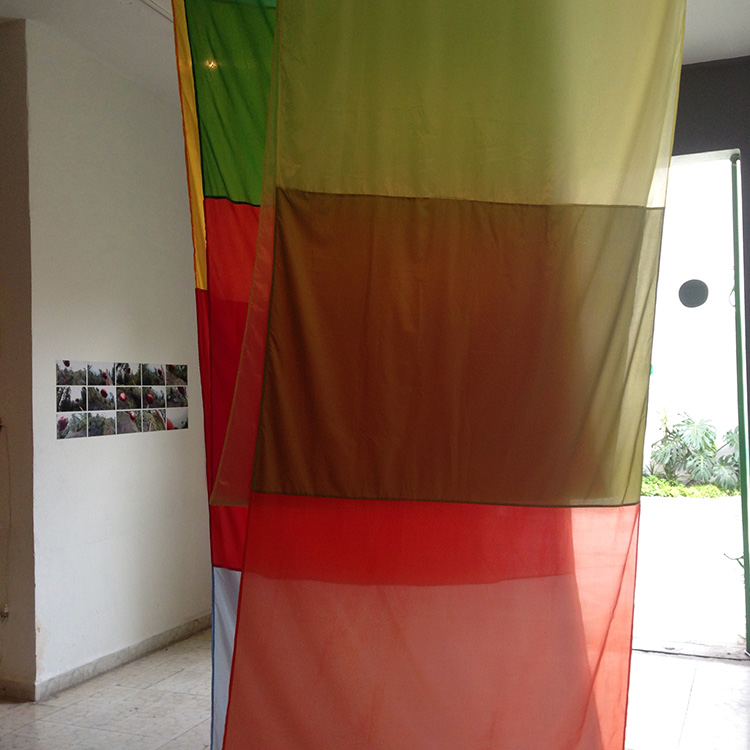 My piece is an installation called Escandón, titled after the neighborhood it was created in. Escandón’s centerpiece is a looping time-lapse video chronicling the sun’s path as shot through a colorful array of shifting fabrics from morning to nightfall. The translucent fabrics, shot against a floor-to ceiling plate glass window of the apartment I stayed in, migrate across one another to produce optically mixed color fields that hint at flag motifs while revealing glimpses of street life outside. The piece is a ‘portrait’ of my time and residence in Mexico, serving as a meditation on the insider and outsider, domestic and public space, nature and artifice, stasis and transition.