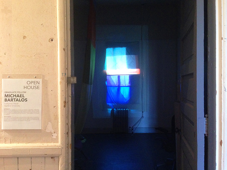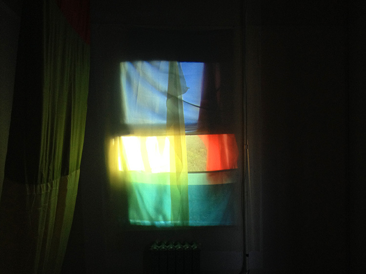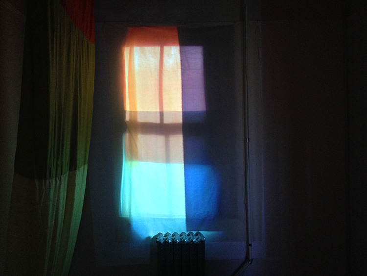 The video was created by photographing a shifting array of translucent color fabrics against my Headlands studio window throughout the day. The sequence was then edited into a short time-lapse loop and projected back toward the sealed window. The projection of light is reversed but the image of light streaming through the window remains.